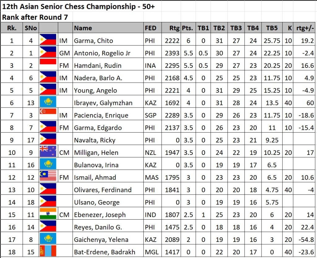 Meanwhile, former Asian Seniors champion IM Chito Garma defeated IM Enrique Paciencia of Singapore to remain in sole possession of the top spot with 6.0 points, a half point ahead of his closest pursuers,  namely GM Rogelio “Joey” Antonio Jr. and FM Rudin Hamdani of Indonesia who notched 5.5 points apiece in the Open 50-above category.