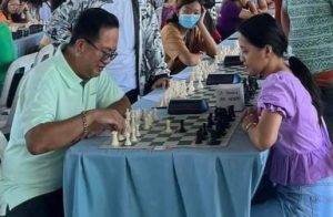 Photo shows San Fabian Chess Club president lawyer Reddy Ceralde Balarbar and SK Chairperson Pamela Ada Fajardo making the ceremonial moves kicking off the one-day tournament,