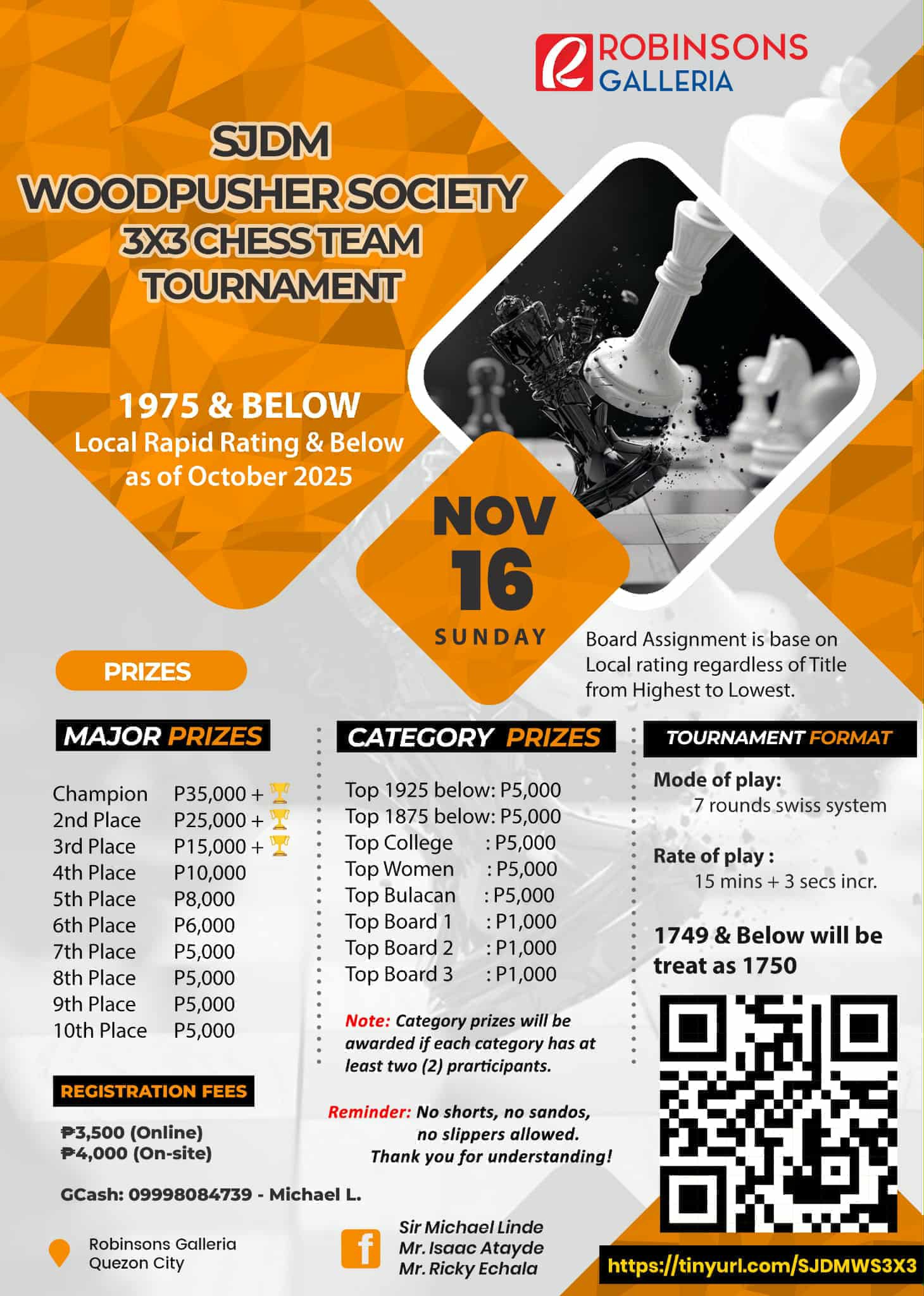 The San Jose Del Monte (SJDM) Woodpusher Society 3×3 Chess Team Tournament gets going at 10.00 a.m. on Nov. 16, 2025 with a big field expected to participate at Robinsons Galleria Mall, Ortigas Avenue, corner Edsa, Quezon City.
