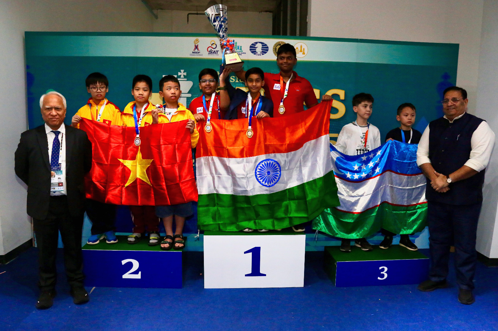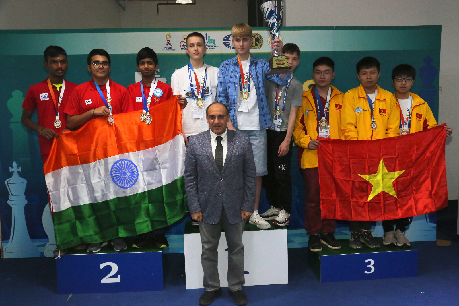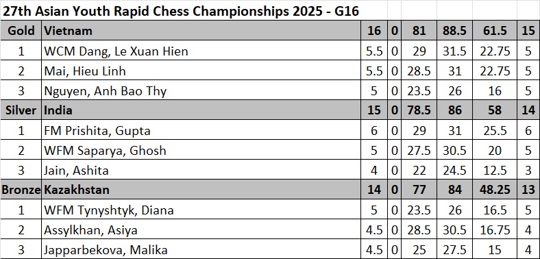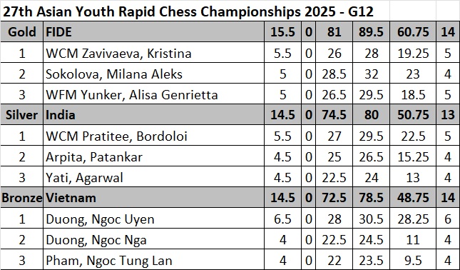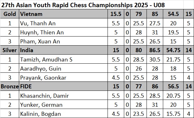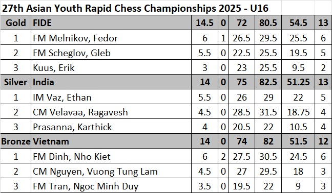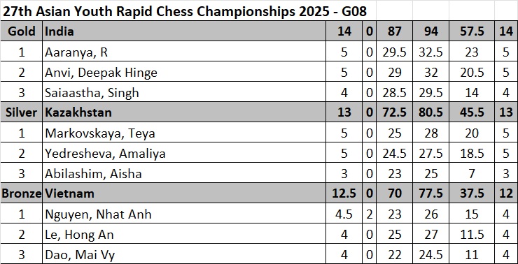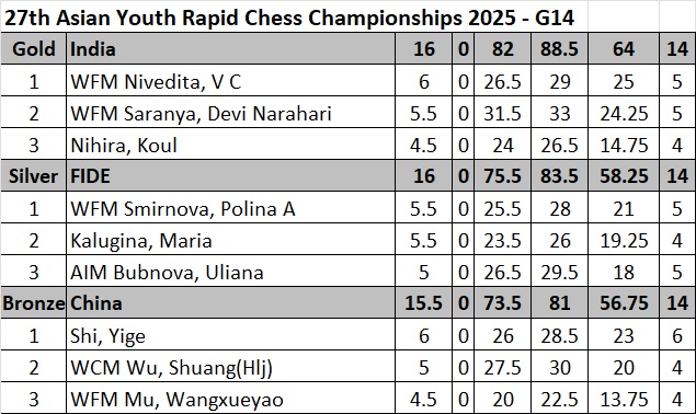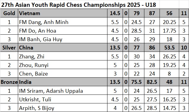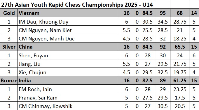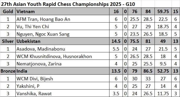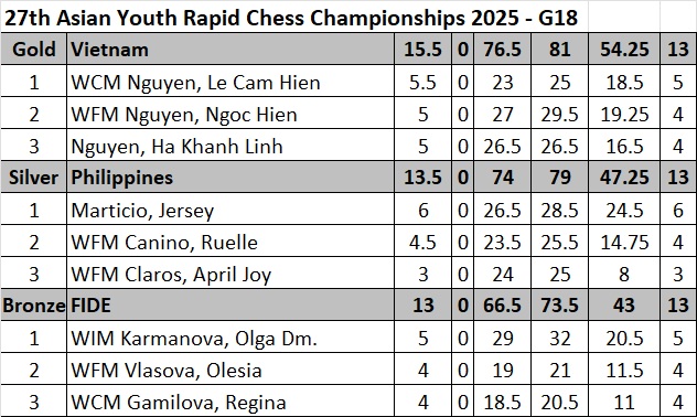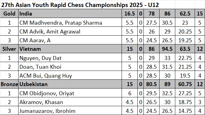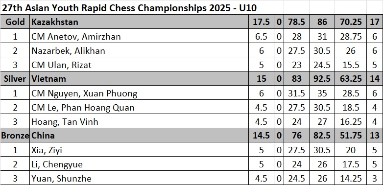 To encourage team work among players from each country, team medals will be awarded per category based on the total score of the top three players of a federation. Federations with fewer than three players will not be eligible for a team award. In case of any tie, the tie-break scores of each player shall be considered.